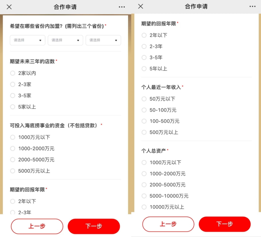 同时,根据其加盟合作申请表的内容显示,申请人需要填写个人真实信息,以及告知希望加盟的省份、期望未来三年内开的店数、可投入海底捞事业的资金额度、期望回报年限、个人最近一年的收入、个人总资产、最高学历、学校名称、就读时间、职业经历、餐饮或其他商业经历、是否有物业资源等一共十几个问题,最后还要填一份不少于30字、不超过1000字的自述。