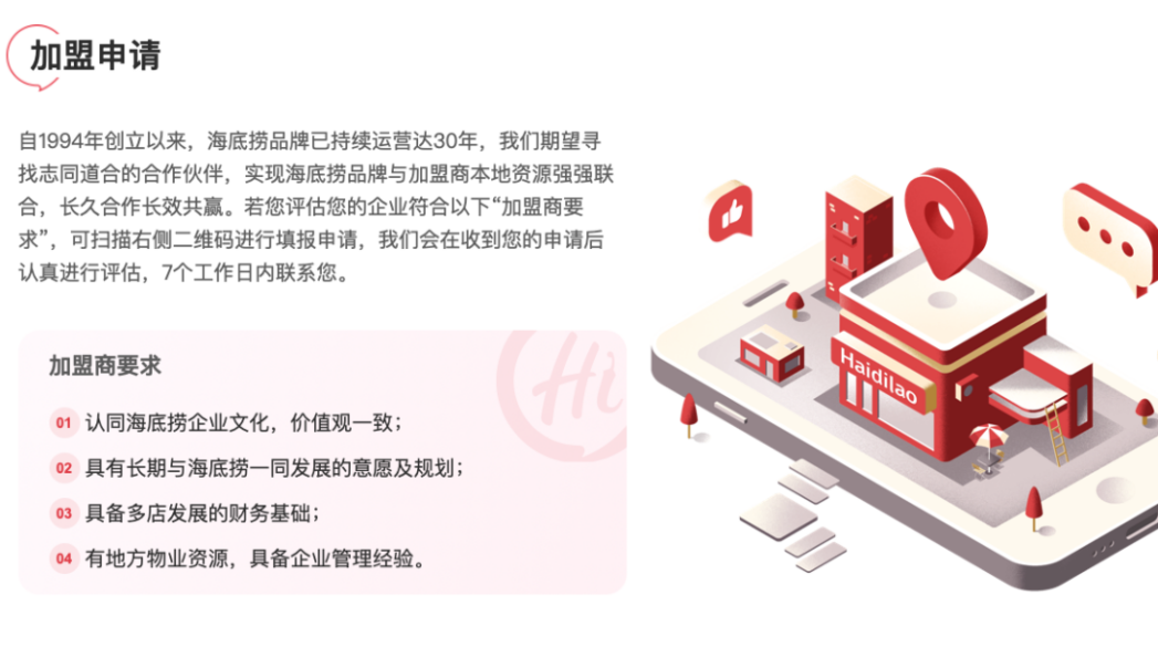 目前,海底捞并没有公开加盟细则,例如加盟费额度、合作模式、投资回报率等。不过,在其官网开放的加盟通道,可以看到海底捞对加盟商有4点要求,包括认同海底捞企业文化,价值观一致;具有长期与海底捞一同发展的意愿及规划;具备多店发展的财务基础;有地方物业资源,具备企业管理经验。