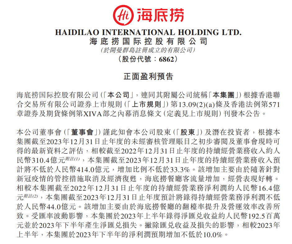 尽管海底捞尚未公布2023年全年业绩,但据此前发布的正面盈利预告显示,截至2023年12月31日,海底捞年度持续经营业务收入预计将不低于414.0亿元,同比增长不低于33.3%;净利润将不低于人民币44亿元。相较于海底捞2019年度的业绩(剔除特海国际业务),2023年营收及净利润预期分别增长不低于65.9%及71.8%,远超疫情前的水平,创历史新高。