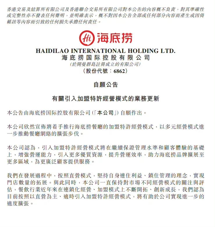 不久前,海底捞国际控股有限公司(以下简称“海底捞”)在创立30周年之际,发布公告称将推行海底捞餐厅的加盟特许经营模式,以多元经营模式进一步推动餐厅网络的扩张步伐。为此,海底捞还成立了加盟事业部,以制定加盟特许经营相关模式细节及商务合作流程。