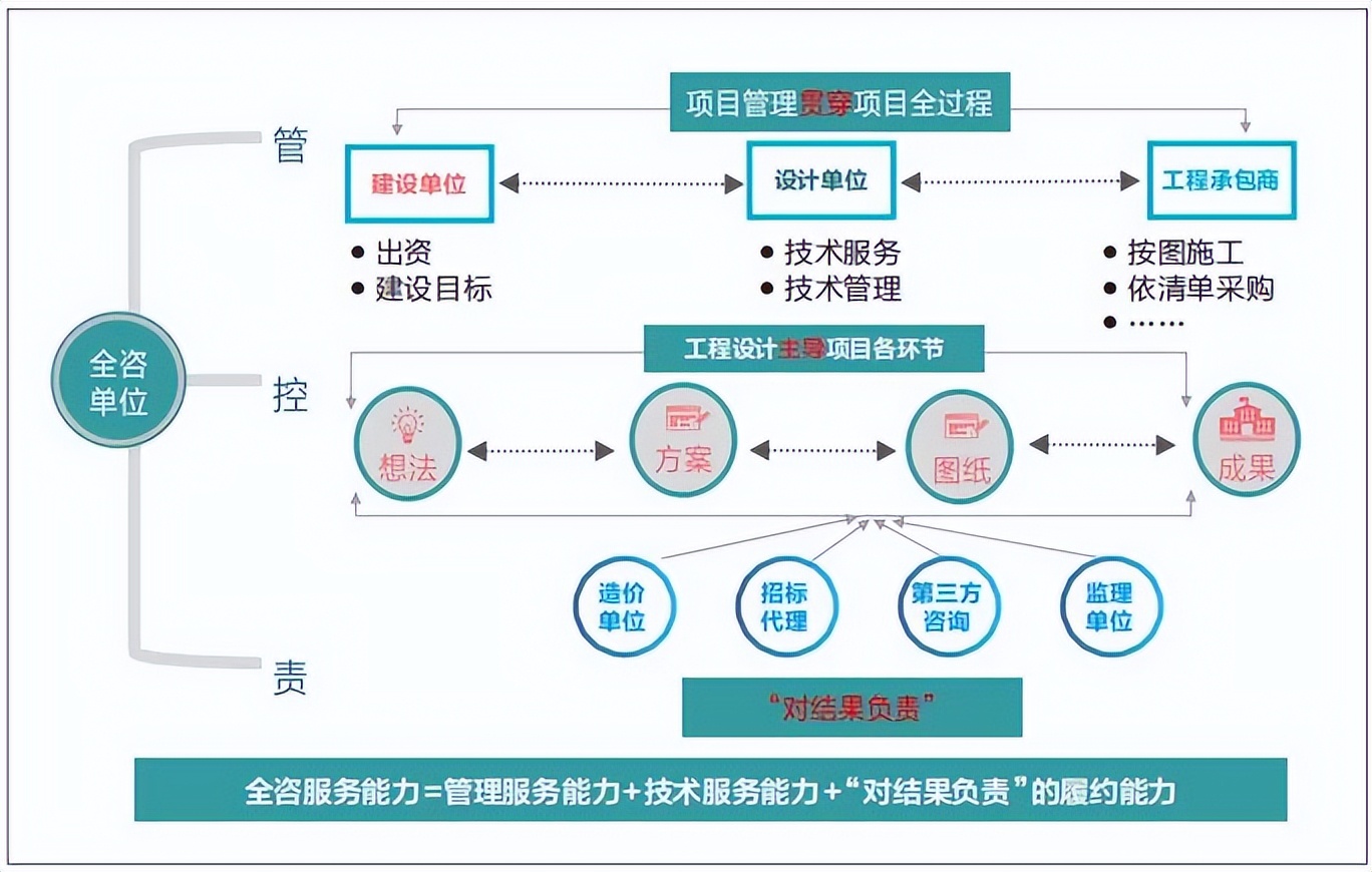 从工程项目建设服务体系简图可以看出,在一个工程项目的建设过程中,核心的路线是工程建设由“想法”到“方案”“图纸”乃至“成果”的过程,在这个过程中,项目管理贯穿项目全过程,履行管理职责;工程设计承上启下,是将工程建设目标转化成技术文件的关键环节,影响并控制着工程及项目建设的各个环节。各项咨询服务确保着工程建设相关子项达到建设目标。所以,全过程工程咨询服务能力应该由管理服务能力+技术服务能力+“对结果负责”的履约能力构成。