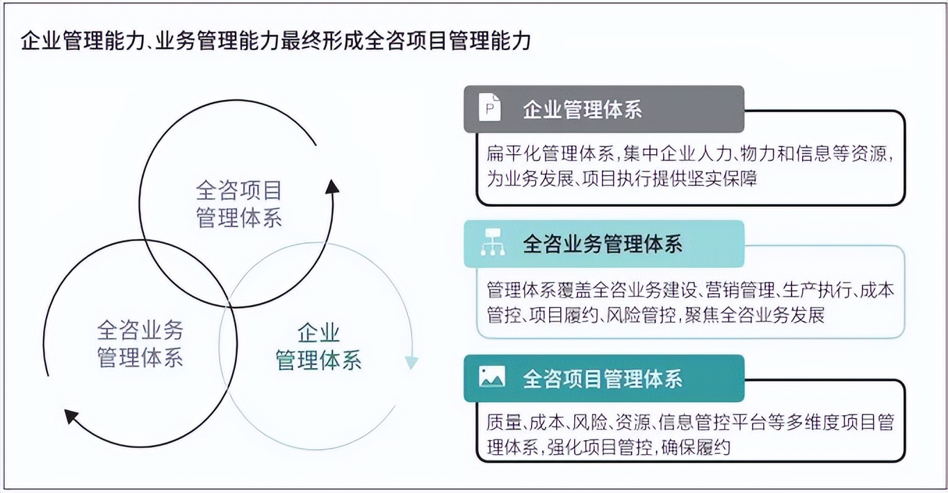二是丰富的项目管理经验及升级版的项目管理体系。搭建全过程工程咨询业务管理体系,通过将企业的管理体系和全过程工程咨询业务管理体系的融合,构建出全过程工程咨询项目管理体系。