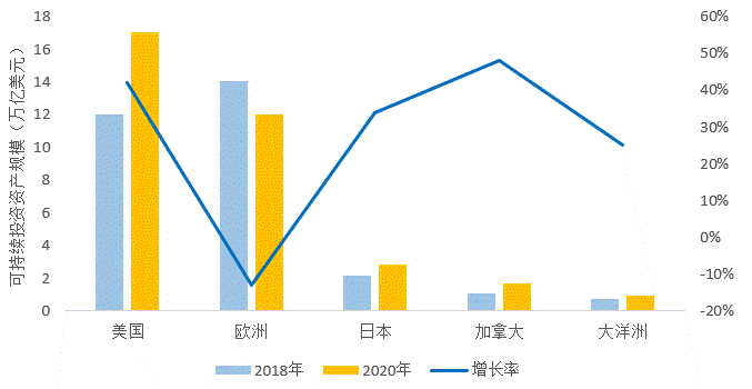 图5 2018-2020年全球主要地区ESG可持续投资资产规模及增长率