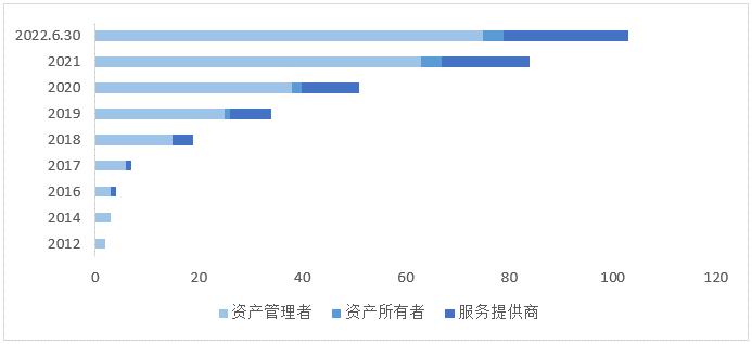 根据UNPRI,日本2020年覆盖的可持续投资资产规模为2.87万亿美元,占全球可持续投资资产的8%,相比2018年的资产规模增长了34%,仅次于加拿大(48%)和美国(42%)。2020至2021年,日本PRI签署机构增至102家,新增16家,同比增长18.6%。截至2022年6月30日,日本共有115家签署PRI,包括资产管理者79家,资产所有者25家,服务提供商11家(图8)。