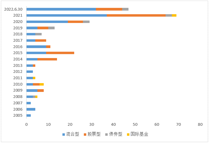 从成立时间和数量方面来看,2019-2021年ESG基金成立数增幅较大。2020年较2019年增长123%,2021年较2020年增长138%。截至2022年6月底,在261只ESG投资基金中,成立三年及以上的共计108只,成立五年及以上的共计90只,成立一年内的共85只。中国ESG公募基金投资市场最常见的是混合型、股票型和债券型基金。根据一级分类标准,混合型、股票型、债券型基金分别占58.2%、33.3%和6.1%。