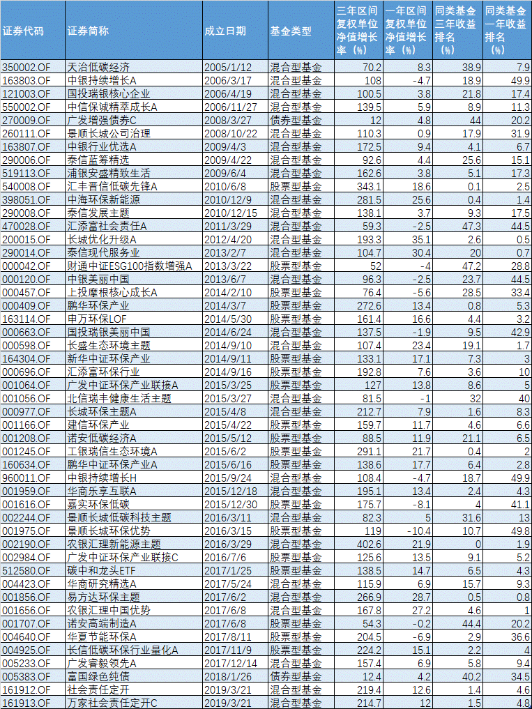 表7 ESG公募基金产品列表(成立超过三年且同类基金三年&一年收益排名前50%)