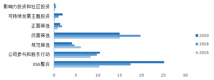 图1 2016、2018和2020年全球可持续投资策略规模(万亿美元)
