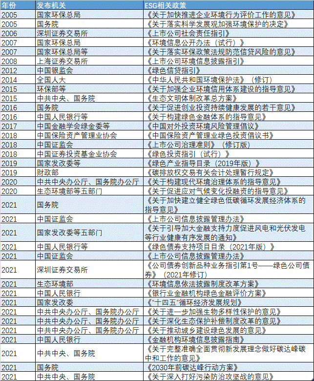 2005年,国家环保总局和国务院相继发布《关于加快推进企业环境行为评价工作的意见》和《关于落实科学发展观加强环境保护的决定》,对环境政策和管理制度进行了改革与创新,在某种程度上意味着中国逐渐开始重视企业在ESG方面的表现。2006年,深交所发布《上市公司社会责任指引》,鼓励上市公司根据指引的要求发布社会责任报告(Corporate Social Responsibility,CSR),CSR报告也是中国早期实践ESG可持续投资信息披露的举措。2008年,上交所发布《上市公司环境信息披露指引》,引导上市公司积极履行保护环境的社会责任,进一步加强了对企业ESG方面的信息披露要求。2012年,《绿色信贷指引》是中国发布的第一项国家级绿色金融政策。2015年,《生态文明体制改革总方案》第一次明确提出构建中国绿色金融体系。