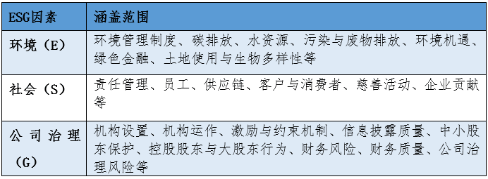ESG投资是指在投资决策过程中将环境(Environmental)、社会(Social)和公司治理(Governance)因素考虑在内的一种投资理念。投资者可以基于上述三个因素,综合考量评估企业经营的可持续性,并据此做出投资决策。具体来说,ESG投资就是将可能影响到企业可持续性经营的环境、社会和治理问题等非财务因素纳入财务分析,并包含在投资与研究的范畴之内。通常,ESG因素的涵盖范围如表1所示。