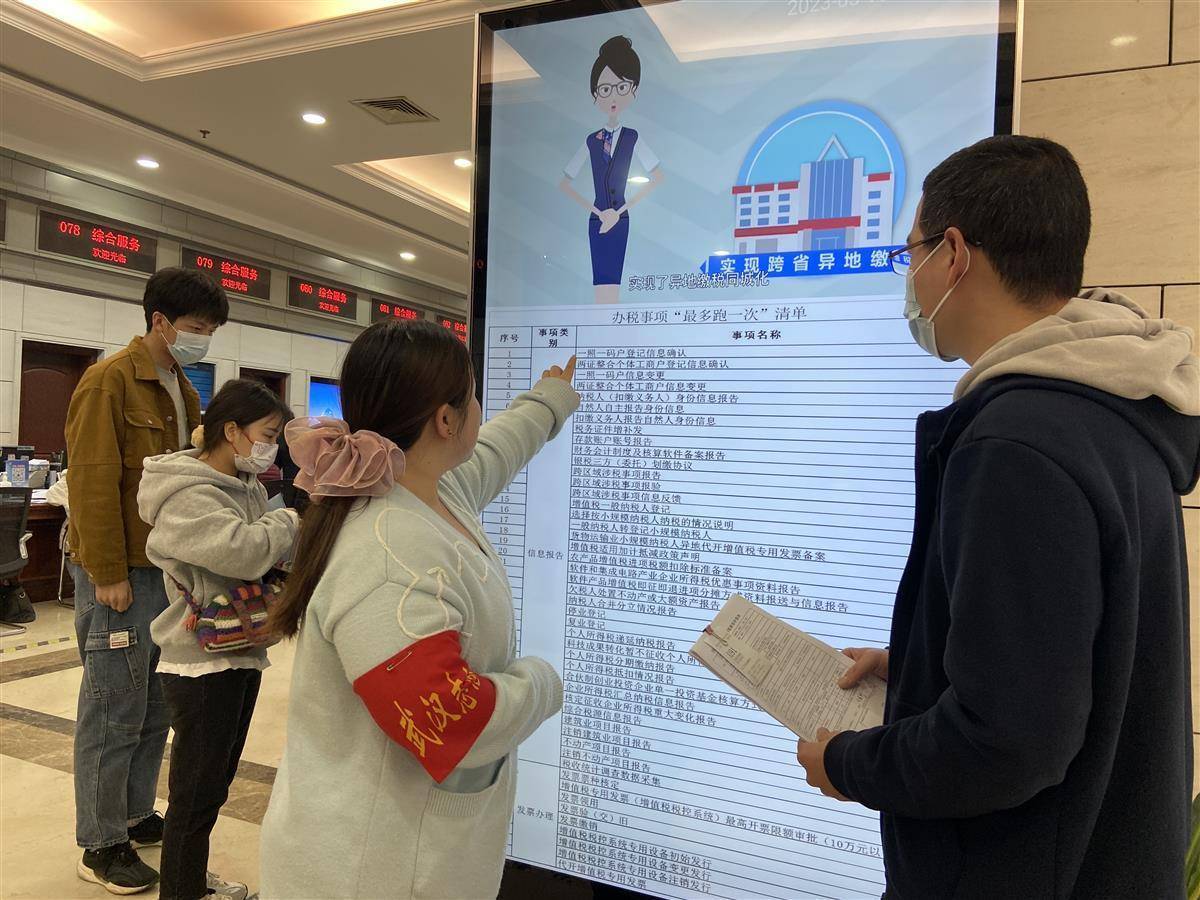 “作为新开办企业,本来正在为如何使用税务Ukey发愁,税收志愿者手把手辅导我们,真是太贴心了。”武汉利欣辰安装工程有限公司的办税人员张菊在“税收志愿者”王婷的帮助下顺利掌握了操作流程。王婷正在人群中向办税群众讲解2023年“便民办税春风行动”第四批便民服务举措及办税事项“最多跑一次”清单。
