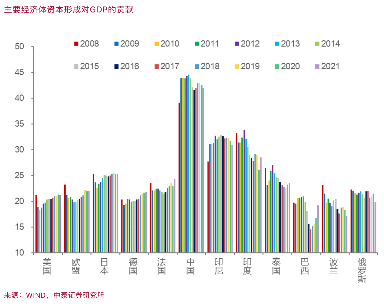 储蓄率高则消费率低,债务负担重则消费意愿弱。这就可以解释居民部门的最终消费对GDP的贡献明显低于全球平均水平的原因。而与之相对应的是,资本形成对GDP的贡献是全球平均水平的两倍左右。