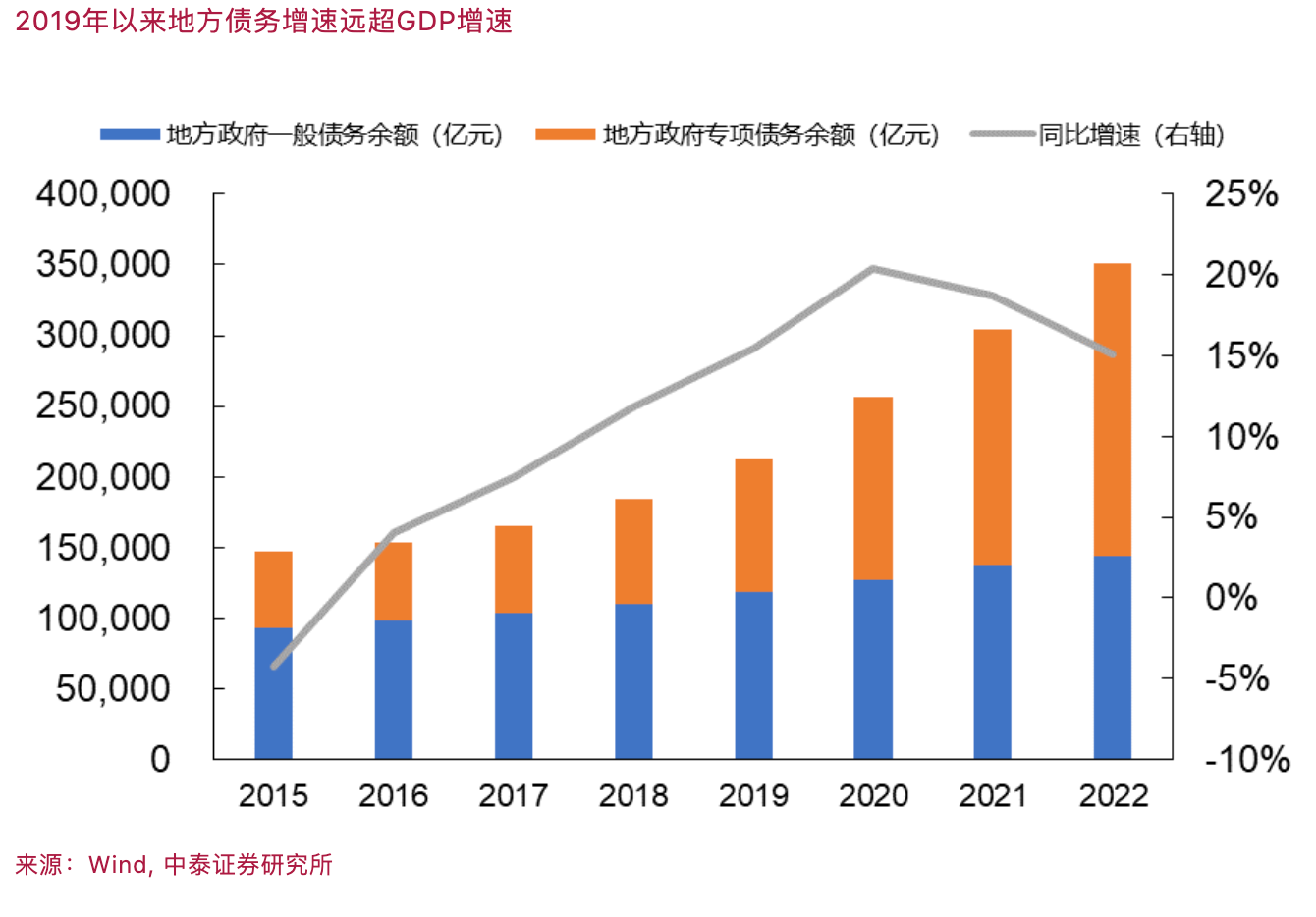 在投资拉动模式下,债务对GDP的乘数效应通常低于1。例如,2022年末,地方一般债务余额14.39万亿元,专项债务余额20.67万亿元,合计35万亿元左右,相较2015年分别增长55.4%、276.2%。2019年以来,同比增速维持在15%以上,大约是GDP增速的3倍以上。