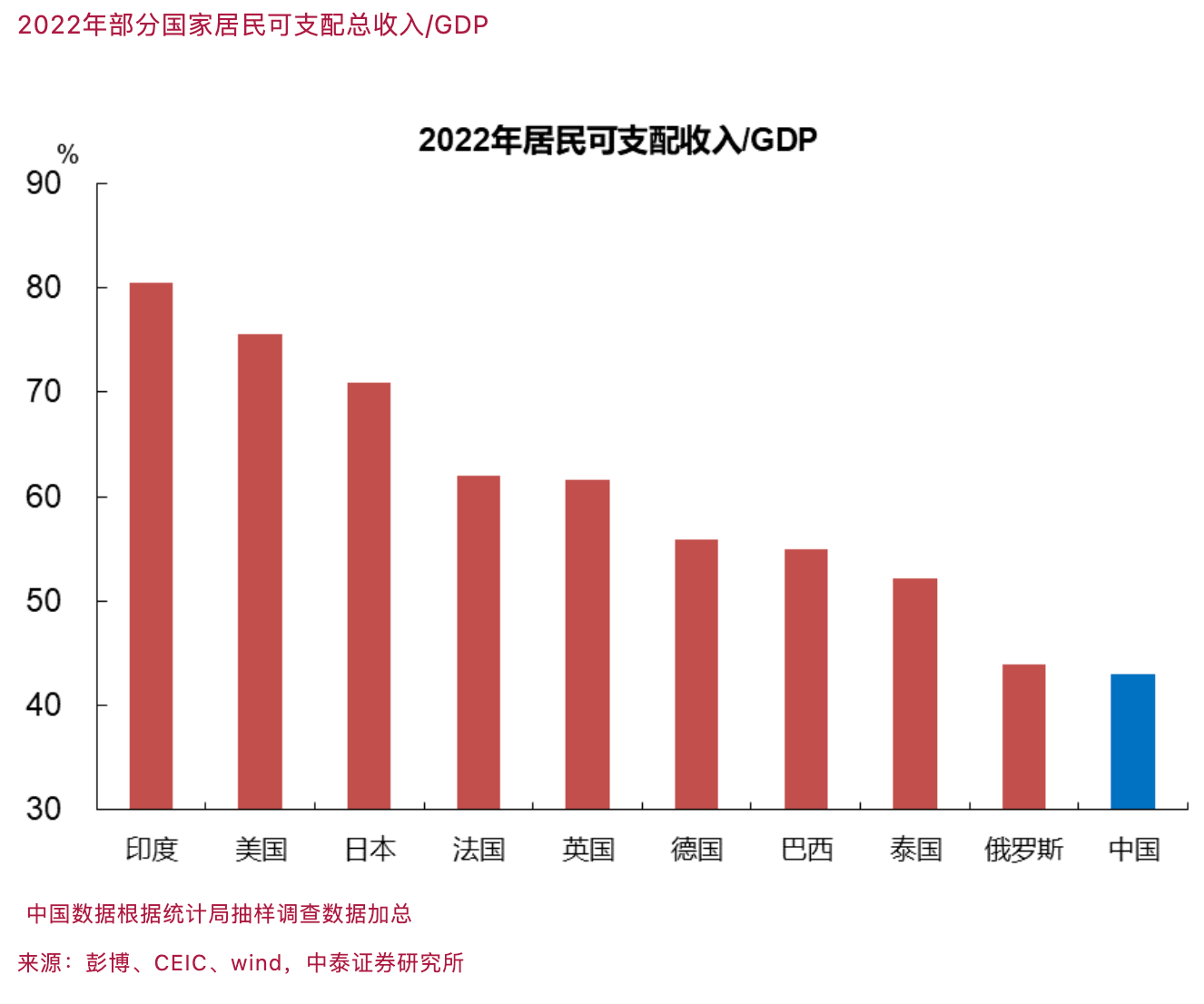 尽管2023年我国最终消费支出对GDP增长的贡献达到82%,但最终消费在GDP中的占比只有54.7%,无论与发达国家还是发展中国家相比(大部分占比在70%~80%),占比偏低。这与我国长期以投资拉动的增长模式有关。