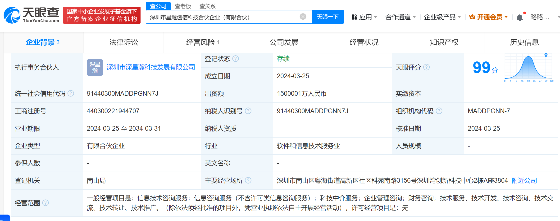 南方财经3月27日电,天眼查App显示,近日,深圳市星燧创信科技合伙企业(有限合伙)成立,执行事务合伙人为深圳市深星瀚科技发展有限公司,出资额约150亿人民币,经营范围含信息技术咨询服务、科技中介服务、企业管理咨询、财务咨询等。合伙人信息显示,该企业由华润深国投信托有限公司、深圳市重大产业投资集团有限公司旗下深圳市深星瀚科技发展有限公司共同出资。