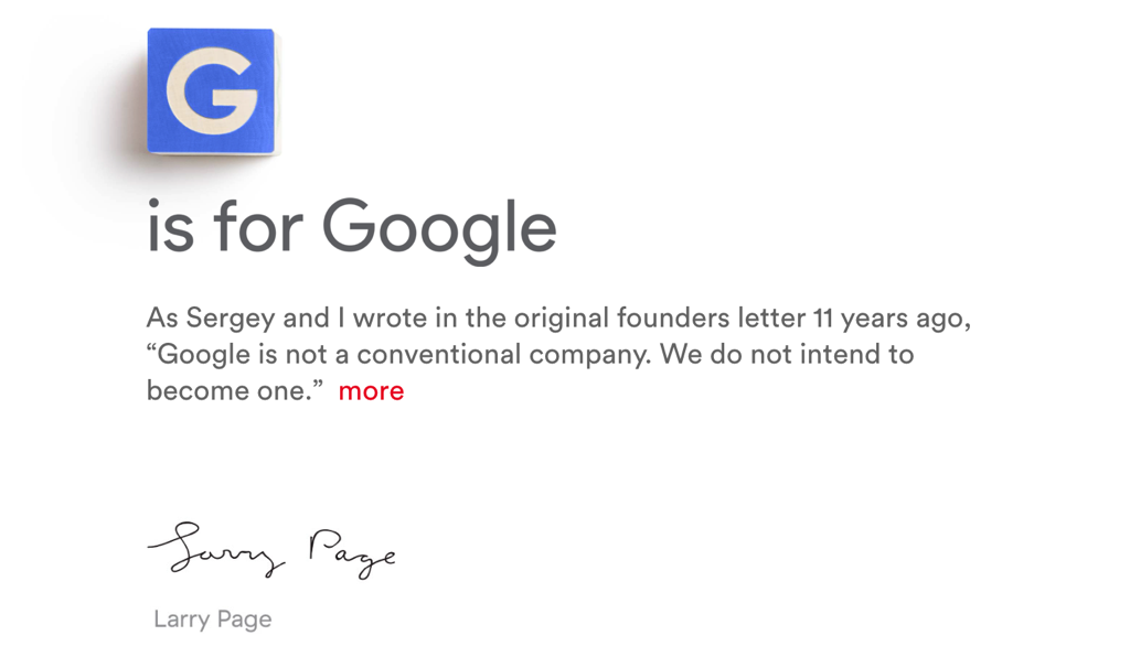 2015年8月,Google联合创始人兼CEO拉里·佩奇宣布公司重组消息。他与另一位联合创始人谢尔盖·布林创办新控股公司Alphabet。Alphabet取代Google在纳斯达克上市,而Google则成为Alphabet的一部分。