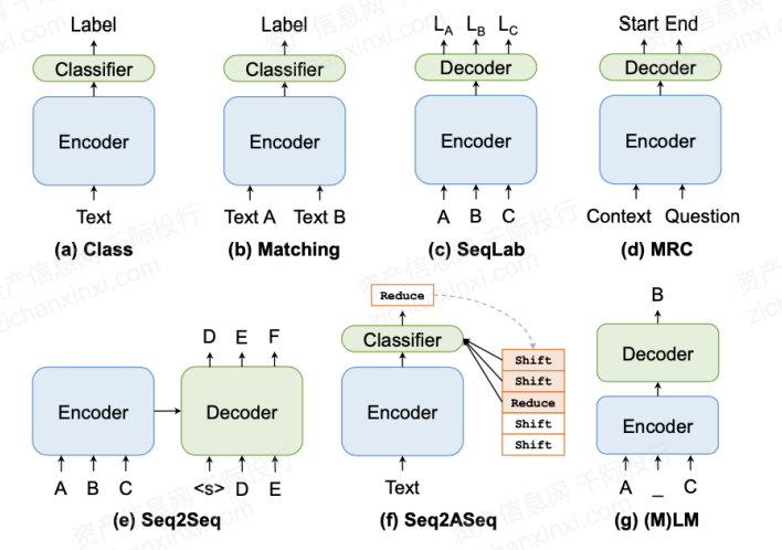 NLP任务中广泛使用的范式归为以下7类,即分类(Class)、匹配(Matching)、序列标注(Seq Lab)、阅读理解(MRC)、序列到序列(Seq2Seq)、序列到动作序列(Seq2ASeq)和语言模型((M)LM)。