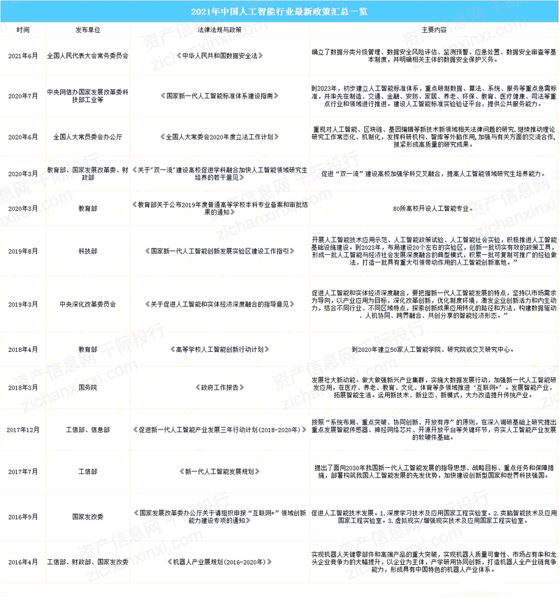 我国在人工智能领域密集出台相关法律法规及政策,可以看出在世界主要大国纷纷在人工智能领域出台国家战略,抢占人工智能时代制高点的环境下,中国政府把人工智能上升到国家战略的决心。