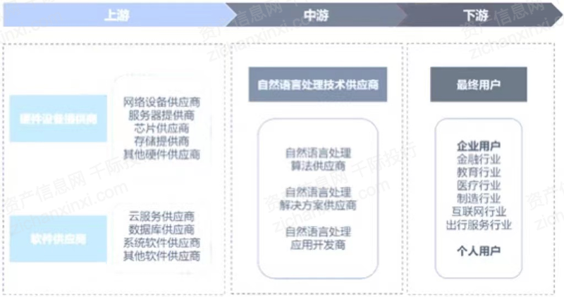 自然语言处理产业链上游市场由基础资源供应商组成,涉及网络设备、服务器、芯片、存储、云服务、数据库等软、硬件供应商,负责为自然语言处理技术和产品开发商提供必要的资源支持。