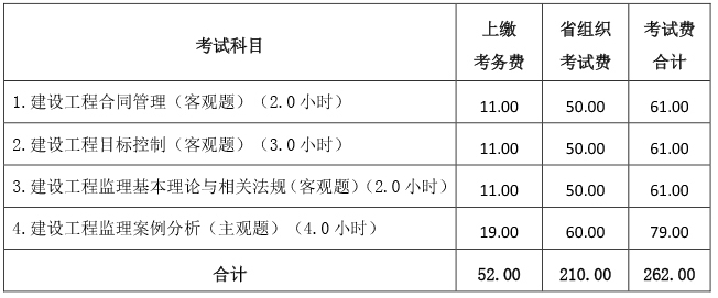 《建设工程合同管理》、《建设工程监理基本理论和相关法规》考试费用61元,《建设工程目标控制》(土木建筑工程、交通运输工程、水利工程专业)考试费用71元,《建设工程监理案例分析》(土木建筑工程、交通运输工程、水利工程专业)考试费用84元。