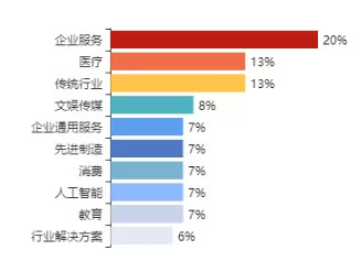 数据显示,教育赛道的投资项目比前两年下降很多,相比企业服务、产业互联网等赛道,教育行业的投资热度明显降低。近一年的行业投资分析数据显示,企业服务、医疗和传统行业的项目投资数量占比位居前三,其中企业服务项目占比20%,而教育行业仅为7%。