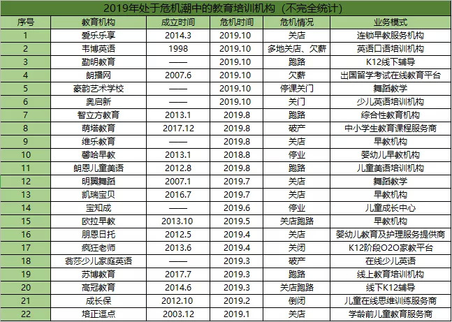 根据公开资料整理,2019年发生倒闭、暴雷、破产等危机的企业有22家,发生时段集中于下半年,早教、素质教育等各个细分赛道都有。