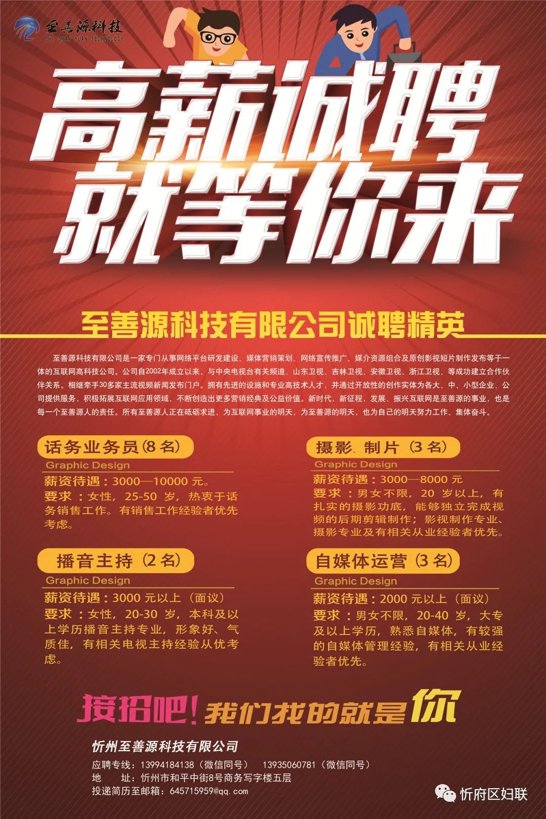 以上人员要求:性别不限,有相关经验者优先,工作要求积极主动,责任心强,有团队精神。有意应聘者请将个人简历投寄本公司人事专员邮箱(243213847@qq.com),注明应聘岗位,合则约见。正式录用后办理入职,提供具有竞争力的薪酬和广阔的个人发展空间。
