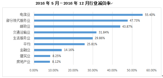 胡怡健团队发现,各个行业的减负率是不一样的。2016年5月,上海全面铺开四大行业营改增之后,至年底的7个月里,3+7行业和四大行业的减负程度比较,电信行业减负最大,达到55.40%,而建筑业和房地产业减负最少,有8%。