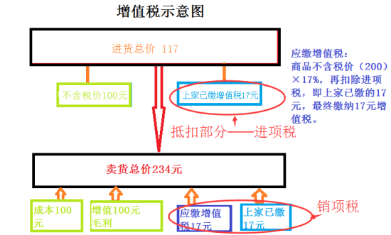 举个例子, 某家企业和上家都是增值税纳税人,以17%计算。这家企业(见以下示意图)采购了117元的货物,其实这个货物中,有100元是货物真实价格,17元是上家缴纳的增值税,就是所谓的进项税。