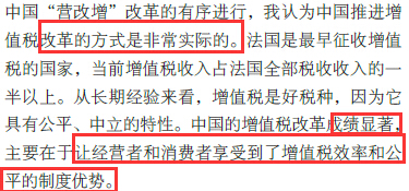 法国财政总署副署长文森特·马佐利克,不但夸中国推进营改增的方式非常实际,而且成绩显著,让经营者和消费者都享受到了增值税改革效率的公平的制度优势。