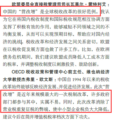 欧盟委员会直接税管司司长瓦莱尔蒙特利尔也盛赞说,中国的营改增是全球税收改革的很好范例。