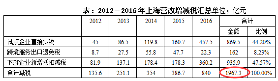 上海是营改增最早的试验地区。上海财经大学公共政策与治理研究院教授胡怡健,在上周四接受笔者采访的时候,他和团队刚刚完成一项长达半年的营改增效果调研报告。他的研究结果显示,5年间,上海营改增为企业减税共计1967.3亿元,全国去年的减税额也刚过5000亿,上海就占了近2000亿。