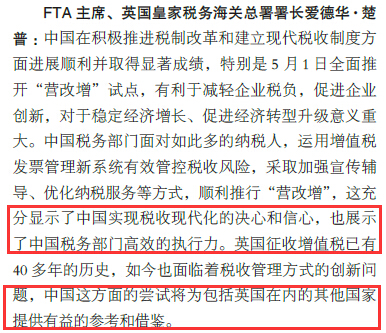 英国皇家税务海关总署署长爱德华楚普说,中国顺利推行“营改增”,展示了中国税务部门高效的执行力、中国在这方面的尝试,将为包括英国在内的其他国家提供有益的参考和借鉴。