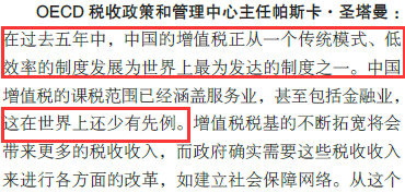 经合组织(OECD)税收政策和管理中心主任帕斯卡·圣塔曼赞得更具体,从中国将金融业也纳入增值税范畴角度讲,他的评价也点中了要害。他说,中国增值税正从一个传统模式、低效率的制度发展成为世界上最为发达的制度之一,尤其是金融也涵盖在增值税的课税范围,世界上都少有先例。