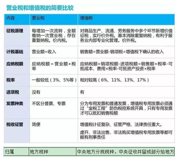 营业税和增值税,都是企业的流转税,就是企业在生产、流通环节,以销售收入或者增值部分来缴纳的税种,而且两种税互相排斥,只能收缴一种,不能重复征收。二者都有向消费者转嫁的特性。