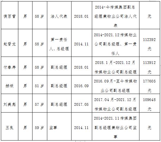 2021年12月,根据山西日报社人事制度改革,赵晋龙、付春寿、刘美彪三名高级管理人员保留事业身份,办理了离岗手续。根据山西日报传媒(集团)物业管理有限责任公司2021年第28次党支部委员会扩大会会议精神,免去赵晋龙同志传媒物业公司总经理职务;刘美彪、付春寿两位同志副总经理职务。