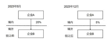 投资架构如上图,居民企业A在2023年5月取得外国企业B股份为20%,并于2023年8月转让15%的股份,2023年末持有外国企业B股份为5%,居民企业A在2023年度持有外国企业B的股份超过10%,符合17号公告规定条件,居民企业A应就外国企业B填报《报告表》,其中第10栏“报告人持股比例(年末数)”“直接持股”应填写5%。
