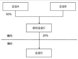 投资架构如上图,居民企业A和居民企业B通过境内合伙企业C持有外国企业D股份。按照合伙协议,各合伙人按照出资比例享有合伙企业份额,居民企业A享有合伙企业C 60%的财产份额和利润分配比例,合伙企业C持有外国企业D 20%股份,居民企业A视同持有外国企业D股份为60%×20%=12%,符合17号公告规定条件,居民企业A应作为报告人填写《报告表》,境内合伙企业C无需填写《报告表》。