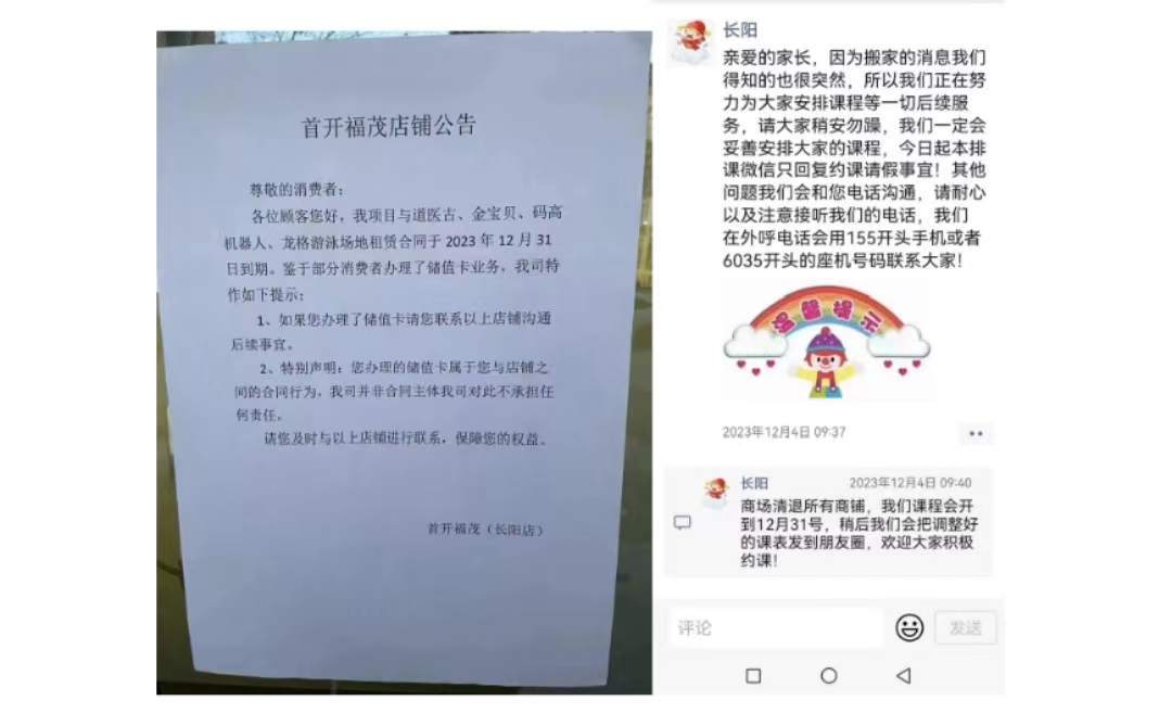 职业闭店人是指帮助经营不善的公司计划好关店、跑路的方法,并接手处理后续维权问题的群体。一位家长在纽哈顿早教中心丰台区门店突然闭店后,拨通了通告上的客服手机号码。