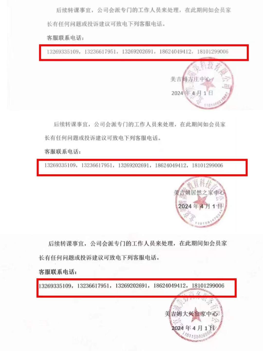 记者梳理关于北京美吉姆多个门店的闭店通知发现,通知内容及客服电话完全一致,多位家长也通过此类“蛛丝马迹”来判断职业闭店人的存在,但是这种推断难以被承认/记者截图