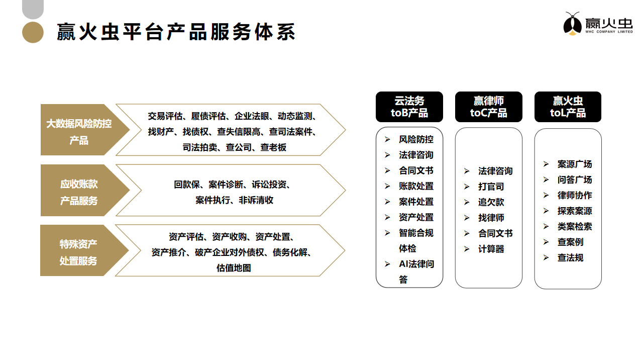 赢火虫平台构建起完善的产品服务体系:云法务系列产品解决企业经营管理全周期面临的法律问题,赢火虫系列产品帮助律师用科技手段提升业务能力和工作效率。与此同时,赢火虫洞察到科技大数据在法律行业具有强大的推动作用,历经三年时间开发出五大核心数据系统作为产品底层支撑,应用于全线业务体系当中。