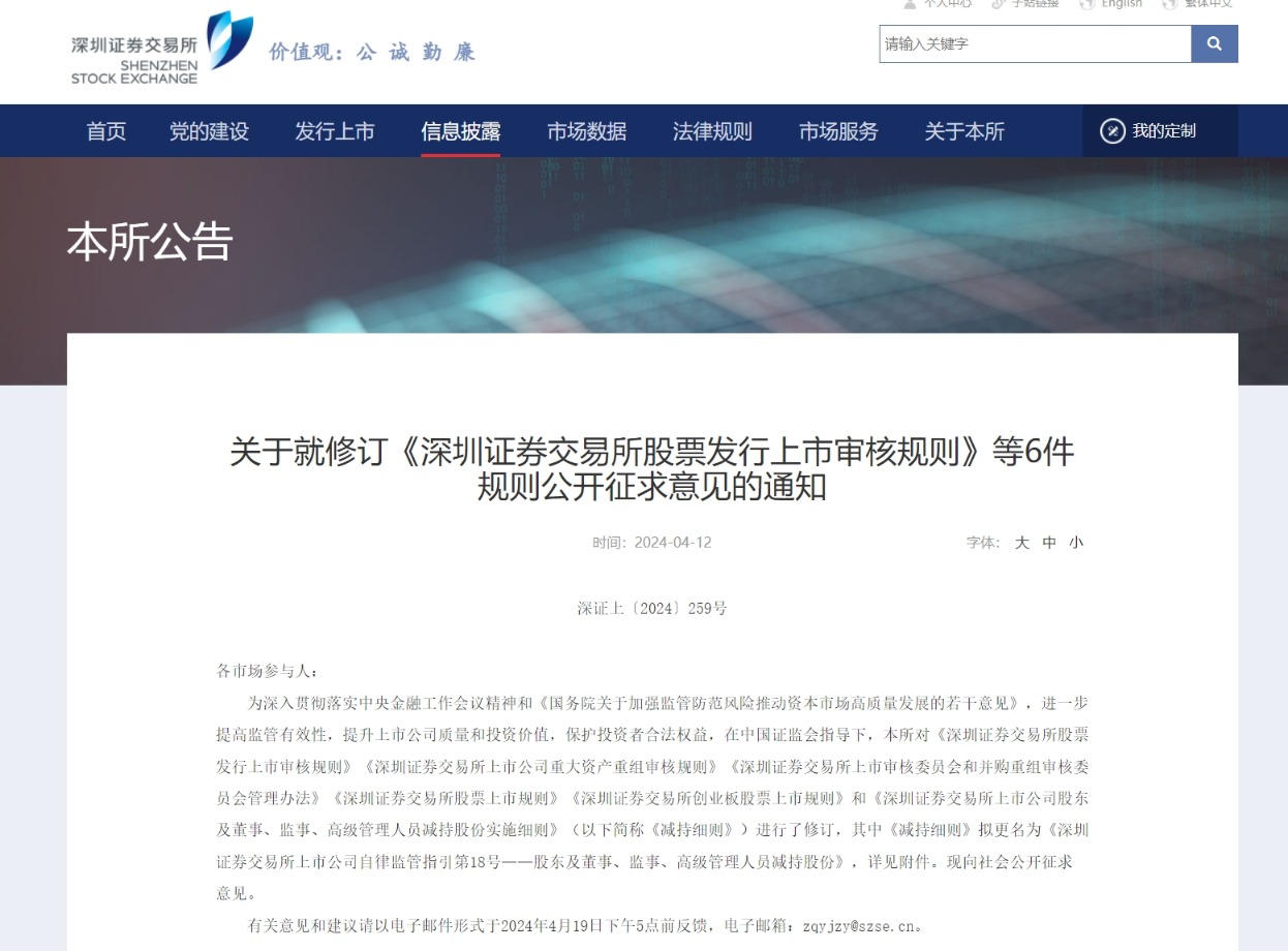 4月12日,深交所发布关于就修订《深圳证券交易所股票发行上市审核规则》等6件规则公开征求意见的通知。