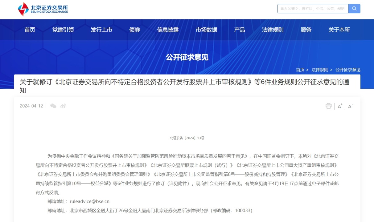 北交所发布关于就修订《北京证券交易所向不特定合格投资者公开发行股票并上市审核规则》等6件业务规则公开征求意见的通知。