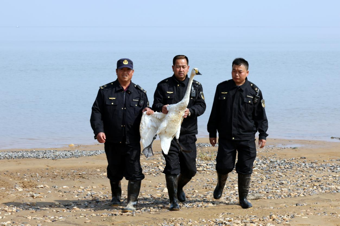 4月8日上午8时30分,江西省永修县农业农村局渔政执法大队一中队队长张波带领护渔队员范忠伟、叶可增在鄱阳湖渔政执法监管日常巡查时,在鄱阳湖吉山边湖水域发现一只落单的白天鹅,打捞上船后立刻上前救助,并拨打了鄱阳湖国家级自然保护区吴城保护站候鸟救护中心电话。吴城保护站工作人员第一时间赶往现场,由于连日来受降雨及上游来水共同影响,鄱阳湖水位快速上涨,导致吴城至吉山村的淘宫庙道路中断。时间就是生命。江西大唐国际永修风电有限责任公司吉山风电场场长吕鑫、永修县吴城镇吉山村西何小组何绪福、何绪谷兄弟俩闻讯后,不顾工作和春耕繁忙,立即驱车开船小心翼翼地把天鹅送到湖边等候的鄱阳湖保护区吴城保护站工作人员手上救助。