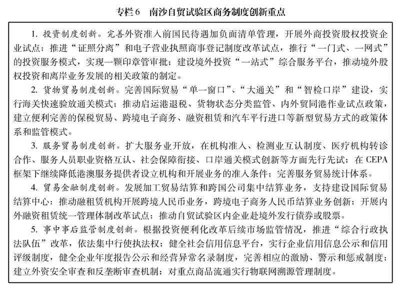 强化国际贸易功能创新集成。积极探索转口贸易、离岸贸易、保税贸易、保税展示、保税期货交割、融资租赁、跨境电子商务、汽车平行进口等新型贸易形态,推动南沙自贸试验区成为国际贸易创新的试验田和国际贸易功能集成区。大力推进南沙跨境贸易电子商务产业园、临港国际大宗商品交易中心、国际采购配送中心、汽车保税中转、进口消费品集散中心、汽车进口口岸暨全球品牌汽车展览中心、海工和重型装备成套供应和出海口基地等项目建设,尽快形成贸易集聚效应和外贸新增长极。促进服务贸易创新发展,培育一批创新发展的服务贸易龙头企业和具备较强竞争力的服务品牌;率先推进与港澳服务贸易自由化,打造成为以穗港澳服务贸易自由化为主导的服务贸易创新发展核心区。