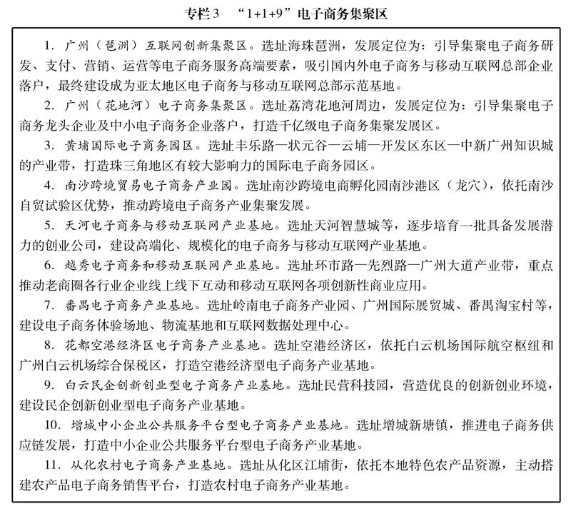“9”:九大特色电子商务产业基地。南沙、黄埔等9区结合各自产业特色和比较优势,发展综合性或行业电子商务平台、电子商务产业物流基地和特色产业平台。