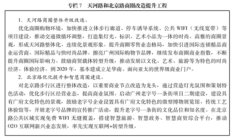 对标世界著名商业街区,打造天河路商圈、北京路商圈分别代表“现代商都”和“千年商都”的标志性区域,完善生态景观和交通、智能信息化、文化设施,进一步提升在国内外的知名度和影响力。加速引进国际品牌、国内知名品牌和品牌旗舰店,集聚发展一批大型高端购物中心和城市综合体。力推天河路商圈成为国内体验式商业的龙头标杆,支持商圈及重点企业引入特色文化、旅游、餐饮、娱乐等业态。活化利用广州传统中轴线和历代古城中心的文化资源,促进北京路商圈商业与文化、旅游、休闲深度融合,形成多元立体的体验空间。