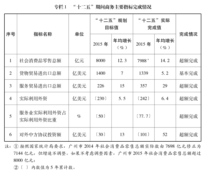 全市完成上下对口的商务管理体制改革,广州市商务委于2015年2月挂牌成立。中国(广东)自由贸易试验区南沙新区片区(简称南沙自贸试验区)挂牌运行,在建立内外资投资负面清单管理模式、建设大通关体系、加强事中事后监管、优化法治环境等重点领域和关键环节取得实质性进展。在全国首创推行外资网上审批服务系统,将外资企业联合年检改为年度申报制度。全面实施境外投资“备案为主、核准为辅”管理模式。开展商事登记制度改革,推进“三个一”(一次申报、一次查验、一次放行)、区域通关一体化和出口退税分类管理等贸易便利化改革。客流和物流枢纽功能强化。2015年白云国际机场旅客、货邮吞吐量分别为5520万人次和154万吨,广州港货物吞吐量和集装箱吞吐量分别达到5.2亿吨和1763万标箱。开展立体化、常态化经贸活动。成功举办广州国际投资年会、夏季达沃斯广州之夜、广州国际购物节、广州国际美食节以及境外招商等贸易投资促进活动230多场,其中境外(含港澳台地区)110多场,境内120多场。“十二五”期间,广州凭借良好的营商环境,连续4年(2012年除外)领衔福布斯中国大陆最佳商业城市榜首。