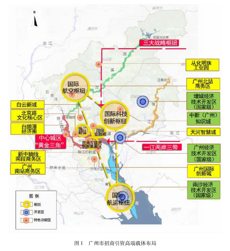 推动建设三大战略枢纽。以南沙新区和南沙自贸试验区、广州港、黄埔临港经济区等为重点,引进航运交易、航运经纪、航运金融保险、船舶管理、航运法律服务、邮轮游艇、船舶租赁等现代航运服务企业,推动建设国际航运枢纽。立足空港经济区、白云国际机场,开展以航空制造、航空物流、飞机租赁、航空维修、航空服务等临空产业和航空产业招商,大力发展临空经济,推动建设国际航空枢纽。以广州高新区、中新广州知识城、科学城、琶洲互联网创新集聚区、生物岛、大学城、民营科技园、天河智慧城等为重点,加快引进知识密集型、资本密集型、技术密集型企业,推动建设国际科技创新枢纽。
