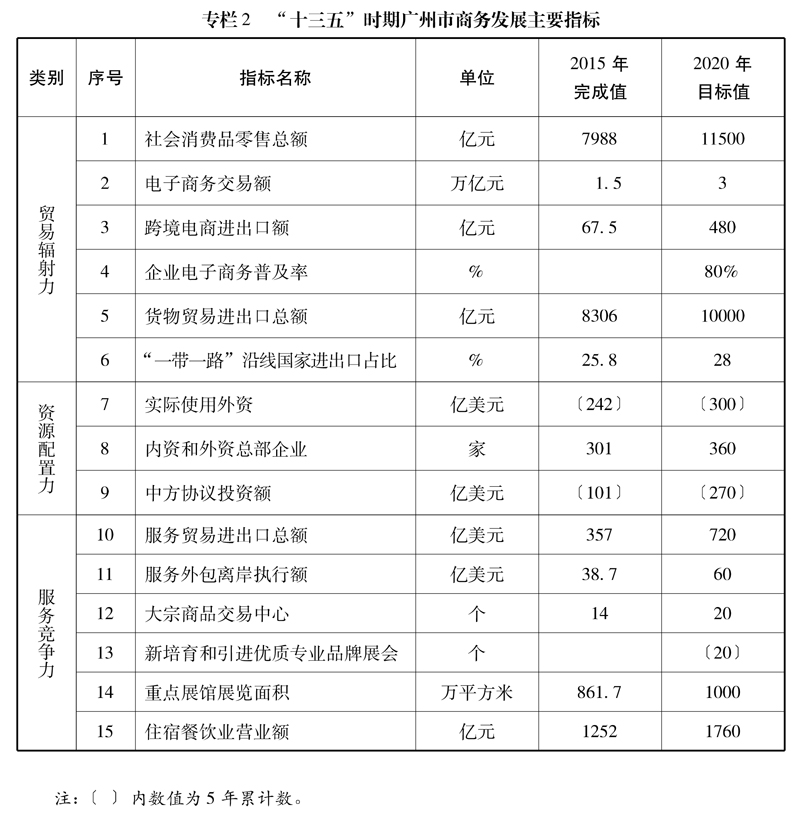 到2020年,基本建成内外贸一体化,“引进来”与“走出去”国际资源双向配置,新兴业态与传统业态双轮驱动,服务贸易与货物贸易协调发展,带动华南、服务全国、辐射“一带一路”和联结全球,具有较强集聚辐射力、竞争力和美誉度的国际商贸中心城市。