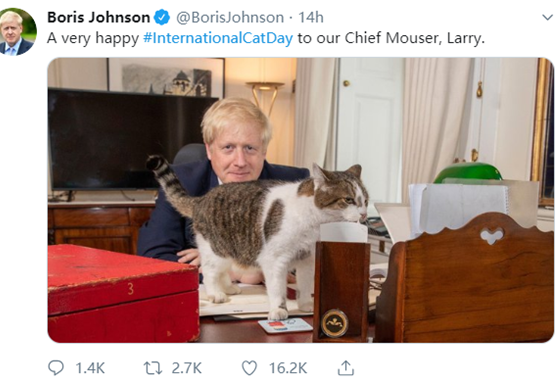 2丨英首相约翰逊上任两周首发办公照:“首席捕鼠官”合影。8月8日“国际猫咪日”当天,英国新上任的首相鲍里斯·约翰逊在社交平台上首次晒出自己在唐宁街10号办公室里的照片:自己与唐宁街10号“首席捕鼠官”——名叫拉里的“御猫”的合照。约翰逊配文称,“祝我们首席捕鼠官国际猫咪节快乐,拉里。”